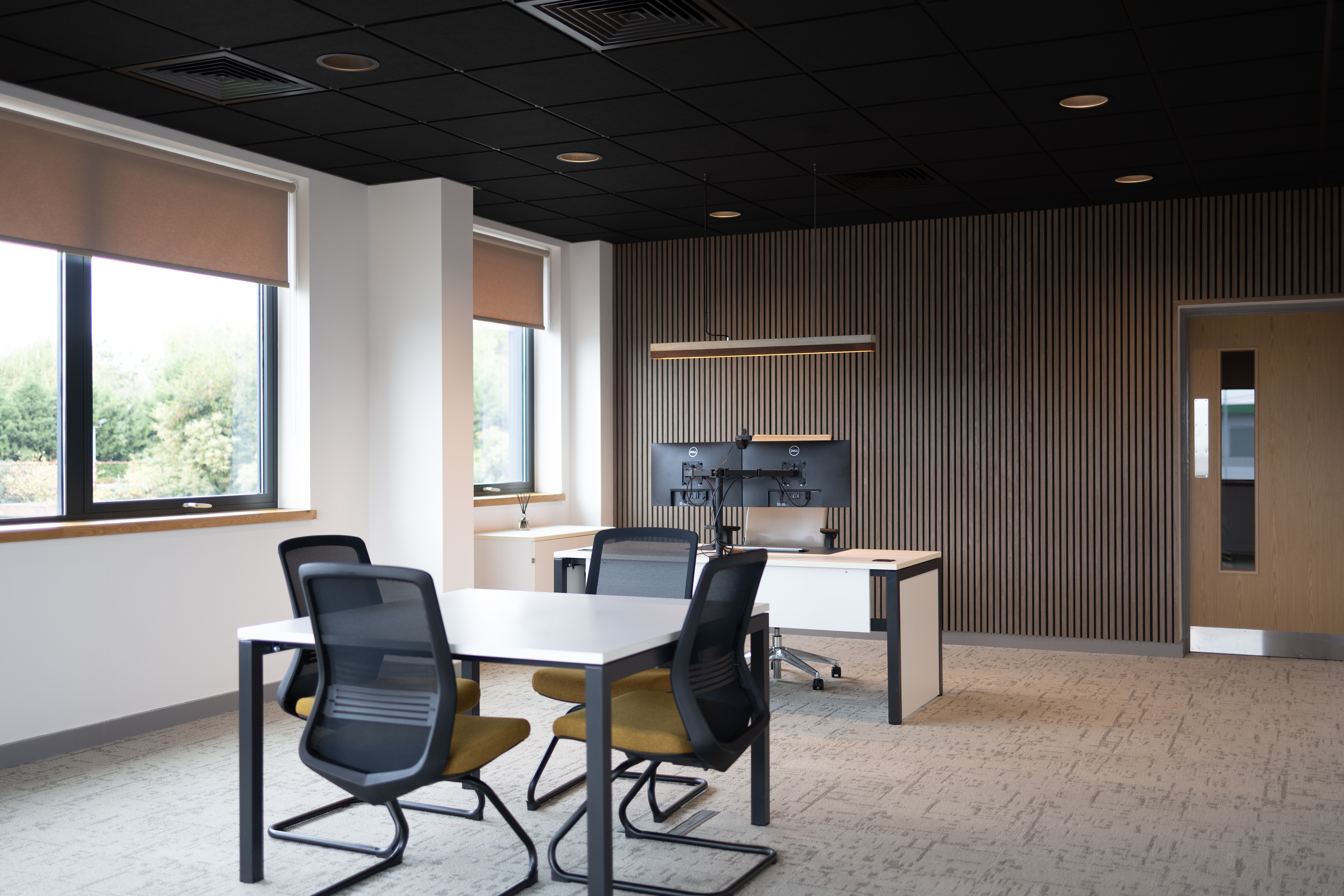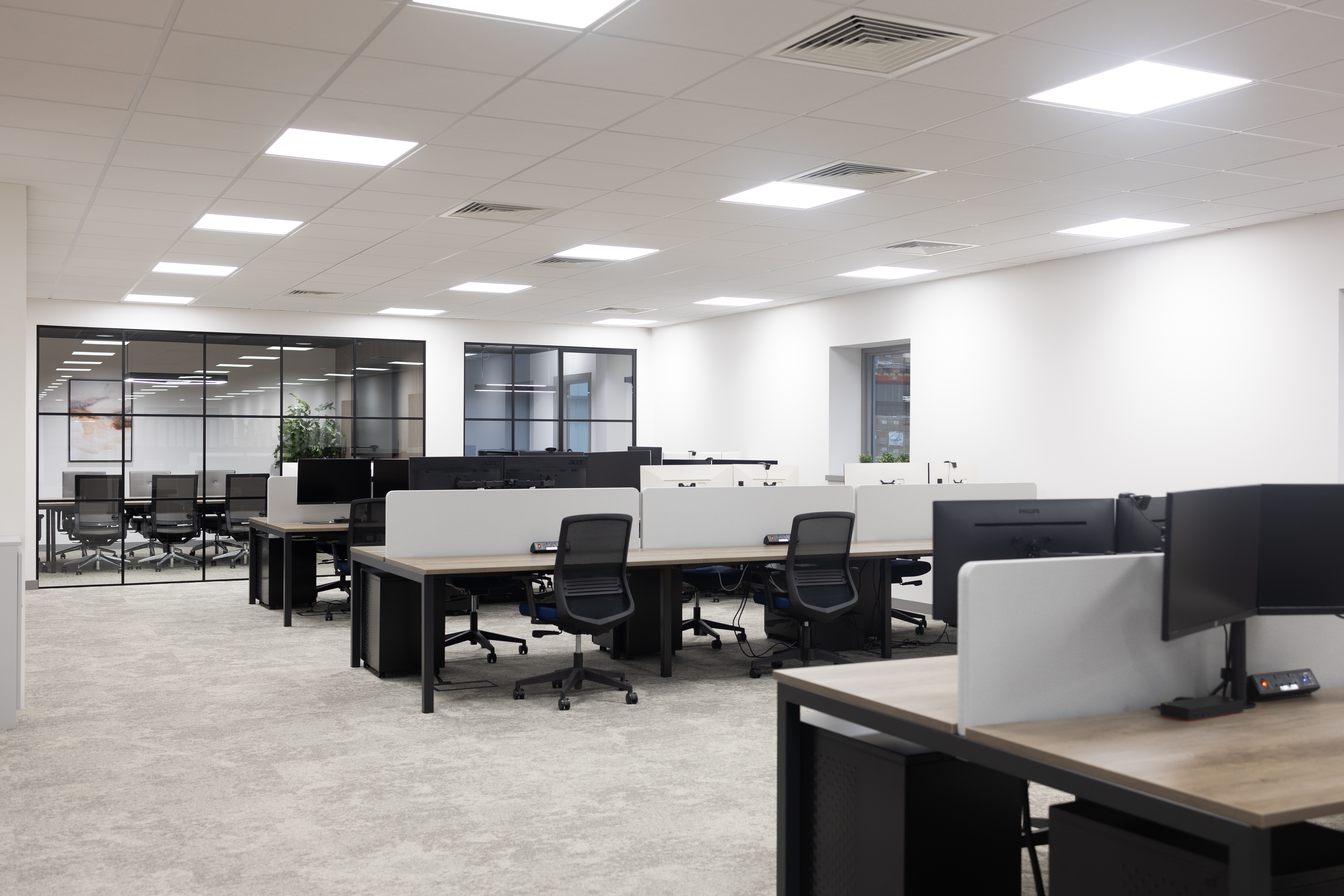 Noise control is a defining factor in how well a workspace performs. Acoustic walls and ceilings and considered space planning help manage sound in open plan areas. Meeting rooms and collaboration areas are designed to contain activity without distrupting surrounding zones.