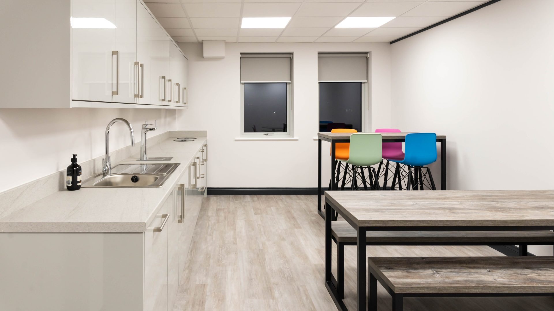 One of the key areas of the project was ensuring that the four separate laboratories on the ground floor were bright, clean and minimalistic which was achieved by using Howdens Greenwich units and Staron solid surface worktops.